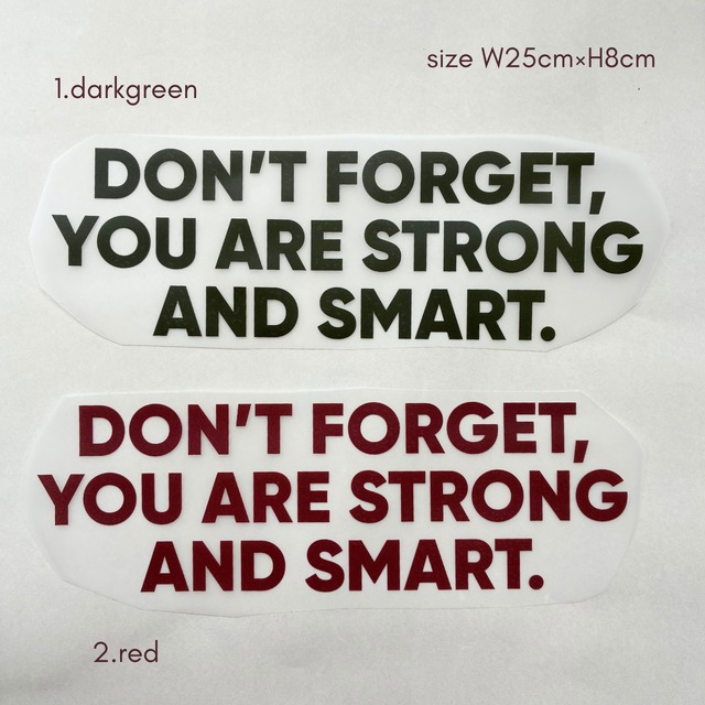 ご家庭のアイロンやプレス機で簡単にプリントが楽しめる、DTFアイロン転写シートです。 Tシャツやバッグ、ポーチなど、幅広い布製品にご使用いただけます。 ※貼り付ける素材がアイロンの熱で変形しないか、必ず事前にご確認ください。 本商品はカット済みのため、貼りたい位置にそのまま配置してご使用いただけます。 ハンドメイドで作るお洋服や布小物にもとてもおすすめです。 ⸻ 【予約販売について】 販売期間 2026/1/26 17:00 ~ 2026/1/28 終日 ※上記期間のみご注文いただけます。 発送予定 2026/2/11ごろ ※製作・発送状況により前後する場合がございます。 ※在庫がある商品につきましては、準備が整い次第、随時発送いたします。 ※即納商品ではございません。 必ず発送時期をご確認のうえご注文ください。 ⸻ 【デザイン内容・サイズ】 Don’t forget, you are strong and smart. (日本語訳:忘れないで、あなたは強くて賢い) サイズ W25cm × H8cm 1枚入り ※大きいサイズです。洋服にも大きなバッグにもおすすめです。 ⸻ 【デザインについて】 「Don’t forget, you are strong and smart.」 シンプルながらも力強い言葉を、 さりげなく身につけられるデザインに仕上げました。 大人から子どもまで、幅広くお使いいただけます。 スポーツやダンス、勉強を頑張る子供たちにも いつでもかけてあげたい言葉です。 ⸻ 【発送方法】 クリックポスト 送料185円(追跡あり) ⸻ 【使用手順】 ① シートを配置する プリントしたい位置に転写シートを置きます。 ② アイロンで圧着する クッキングシート(オーブンシート)を上にのせ、 アイロン中温(スチームOFF)で約10秒、しっかり押し当ててください。 ③ 冷ましてから剥がす(コールドピール) 完全に冷めてから透明フィルムをゆっくり剥がしてください。 ⸻ 【洗濯について】 ・圧着後48時間以上経ってから洗濯してください ・裏返し&洗濯ネット推奨 ・乾燥機、漂白剤は使用しないでください ・プリント部分へ直接アイロンはかけないでください(当て布必須) ⸻ 【ご注意事項】 ・一度圧着した部分へ直接アイロンを当てると、デザインが溶ける可能性があります ・薄手の布地は裏側に糊がにじむ場合があります(裏側にもクッキングシート推奨) ・細かい余白部分の糊は、圧着前に軽く取り除くと綺麗に仕上がります ・必ず目立たない部分でテストを行ってから本番にご使用ください ・商品の性質上、返品・交換はお受けできません