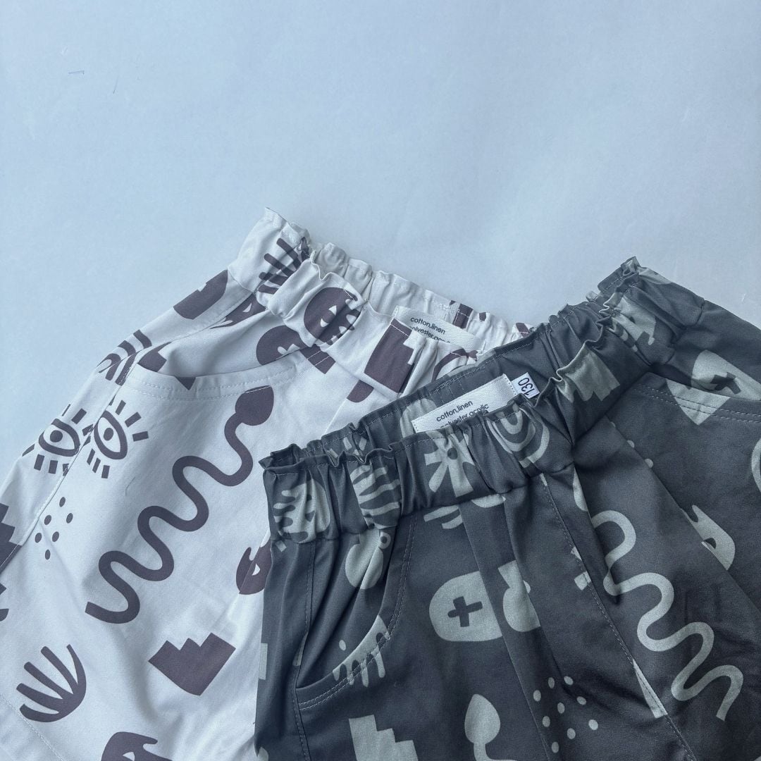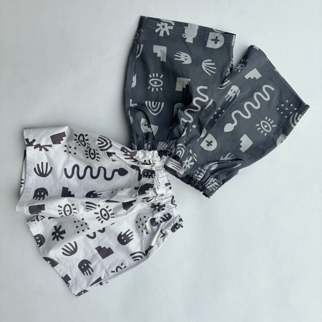 テキスタイルデザイナー milkbushboy の「earth eye」デザインを使用したショートパンツのサンプル作品です。